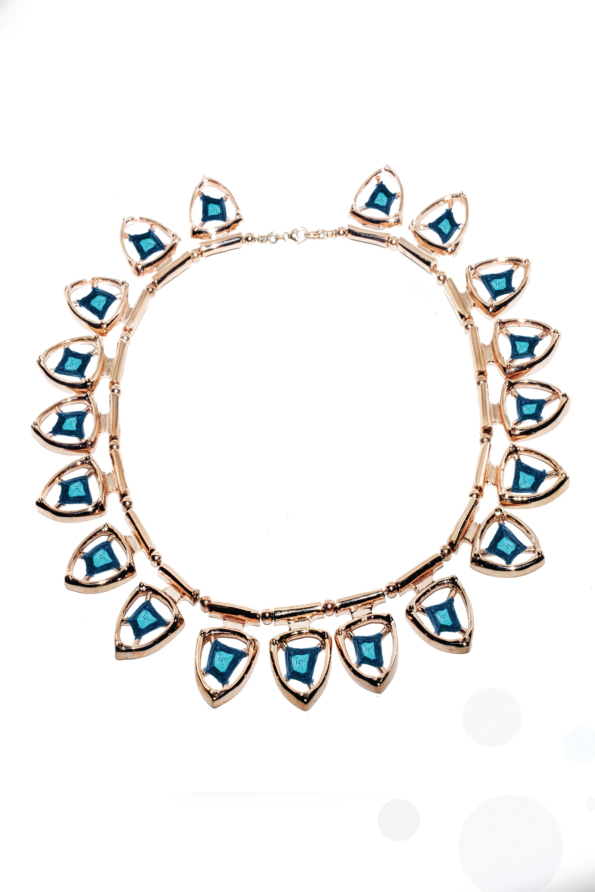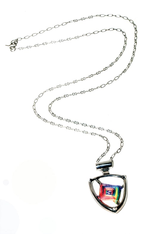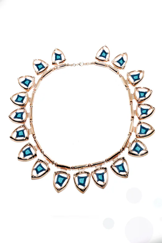 «Осінньо-зимова колекція бере деякі форми з весняно-літньої колекції 2013 року і ніби заповнює цей порожній простір, створюючи полотно для прикрашання цього простору», — розповіла Бір. «Ось те обплетення, яке ви бачите», — додала вона, вказуючи на бірюзову нитку, що ретельно обмотана навколо кожного «Ока Бога», створюючи гіпнотичне та унікальне намисто.