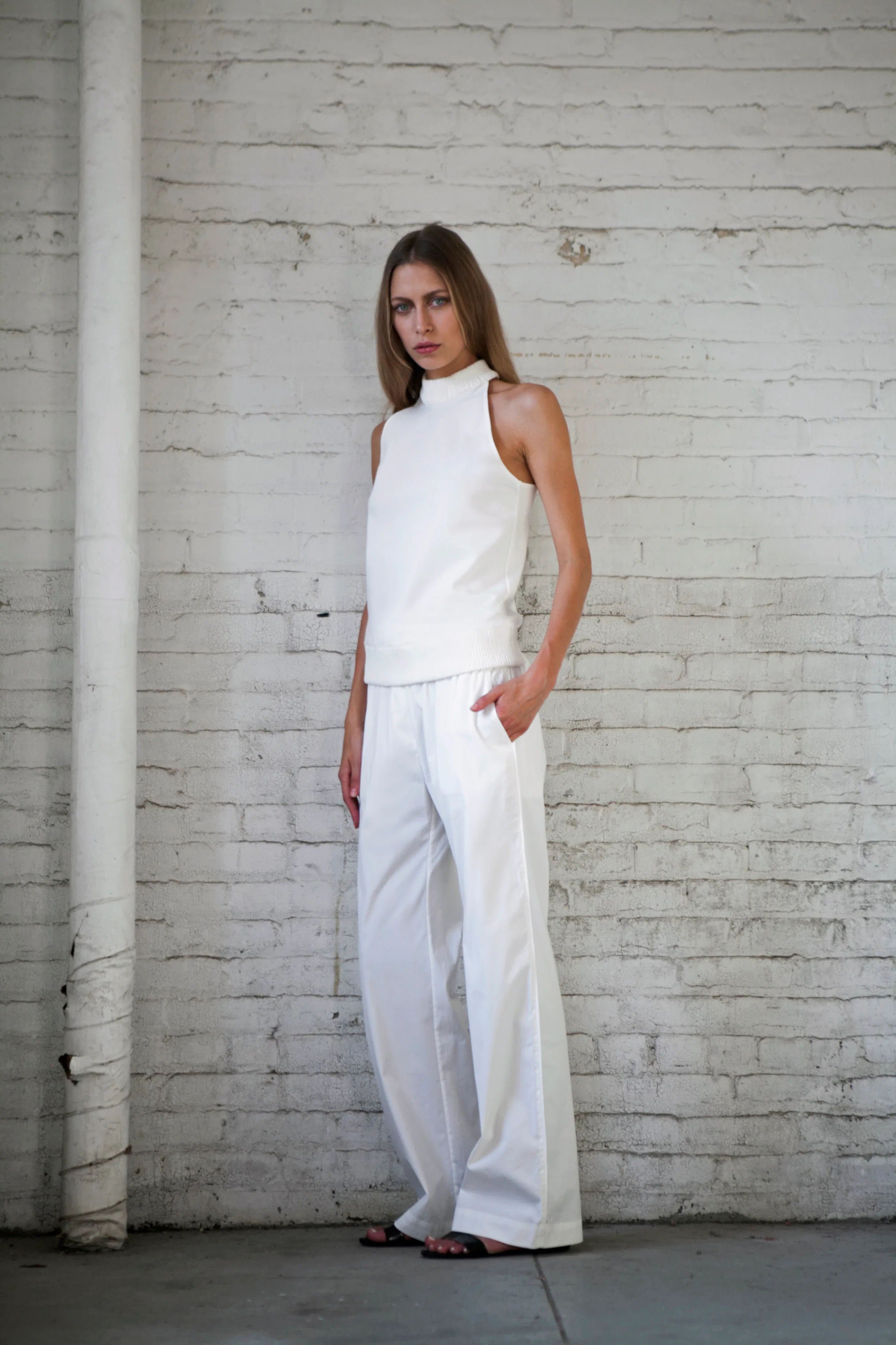 Из одного из гладких черных чехлов для одежды она достает белый смокинг-блейзер, сшитый из необычного плотного трикотажа. Самая эффектная часть ансамбля — соответствующая ему юбка в пол с разрезом до середины бедра, напоминающим наряды Анджелины Джоли, которая открывает вид на короткие шорты под ним. Практичность встречается с вечерним дресс-кодом. Она продолжает показывать: шелковая майка с двойным слоем и игривыми перекрещивающимися бретелями. Белый шелковый туник с рукавами-колокол, напоминающий модель Ива Сен-Лорана в стиле 70-х. Лю объясняет, что это ключевая вещь в её коллекции и в её жизни, так как она может использоваться и как топ, заправленный в джинсы, и как накидка.