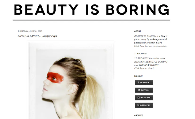 Возможно, ни одна среда не показала эту идею лучше, чем блоги о красоте. Существует так много вдохновляющих бьюти-блогеров, которые не просто фокусируются на обзорах продуктов и дают советы по созданию идеальной стрелки. Визажист и фотограф Робин Блэк использует свой блог «Красота — это скучно» (Beauty is Boring), чтобы демонстрировать образы, которые не просто красивы, но и креативны, и выразительны. Для Блэк конечная цель макияжа — не быть красивой. Она пишет на странице «Обо мне» своего блога: «Сколько себя помню, у меня были отношения любви/ненависти с красотой. Это сложная, субъективная вещь». Вместо гламурных или сексуальных образов Блэк создаёт произведения искусства с помощью макияжа, делая всё: от масок бандитов из оранжевой помады до макияжа глаз, вдохновлённого звёздами на небе. Блог Блэк — доказательство того, что макияж действительно может быть формой художественного самовыражения.